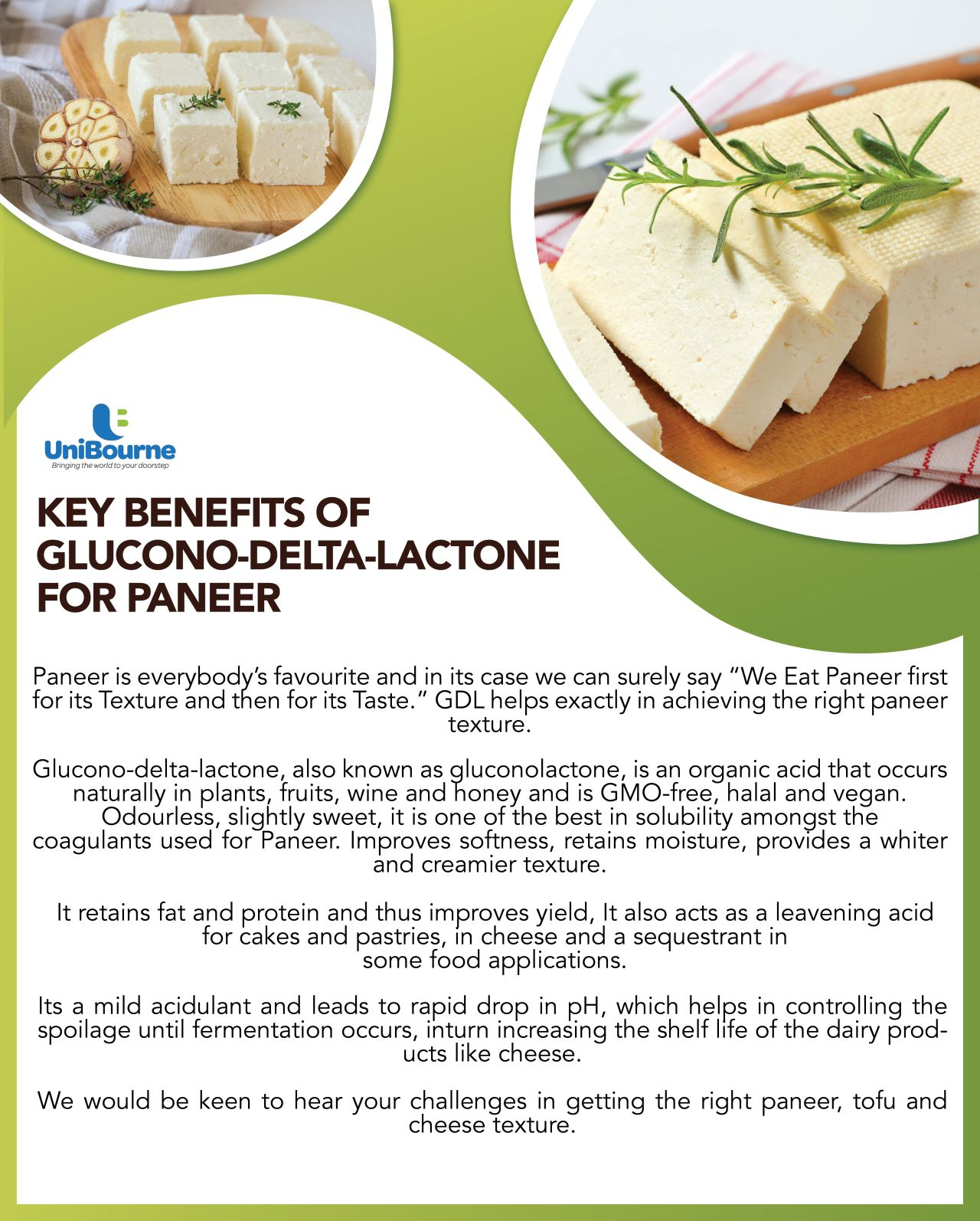 本品在水溶液中水解产生葡萄糖酸,使蛋白质凝固,效果比硫酸钙、氯化钙及盐卤好。用葡萄糖酸内酯制得的豆腐,保水性好,质地细腻,滑嫩可口,对豆腐并具有防腐作用。