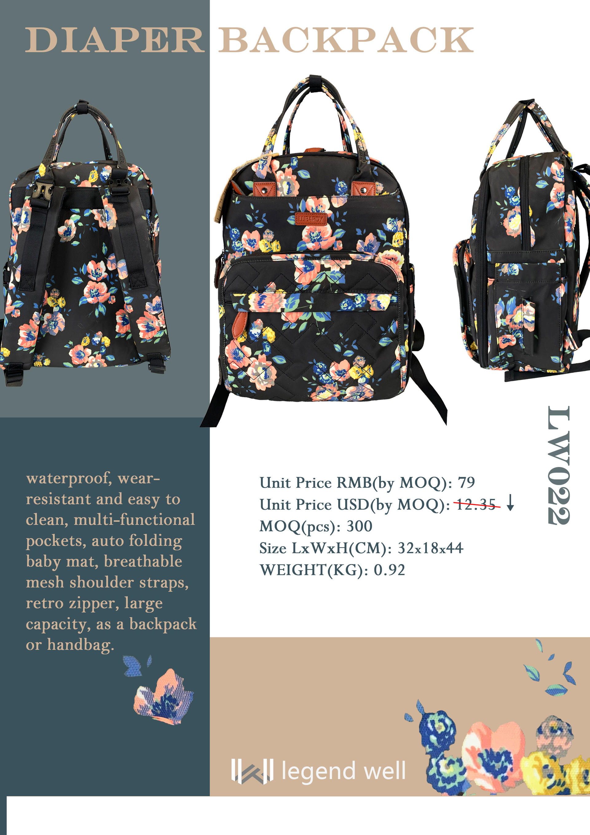 流線型設計,卡夾口袋,超寬開口,防盜後袋,便攜式換尿布墊,可自由拆卸的背包帶,耐用,易於清潔。 -