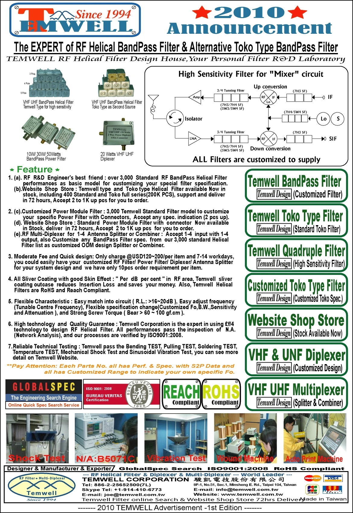 駿凱電技本著專業設計及生產RF BandPass環型濾波器的多年經驗及技術,進行開發生產Toko 濾波器的標準代用品,以更高更好的規格給客人使用,並且提供大廠所不提供的客製化服務,Toko Fitler 標準規格客製化服務,希望提供給RF研發工程人員更快更精準的產品,若需要相關的規格書,曲線圖、產品規格尺寸,腳位圖以及基本介紹,歡迎上Temwell 官網www.temwell.com.tw 查詢。