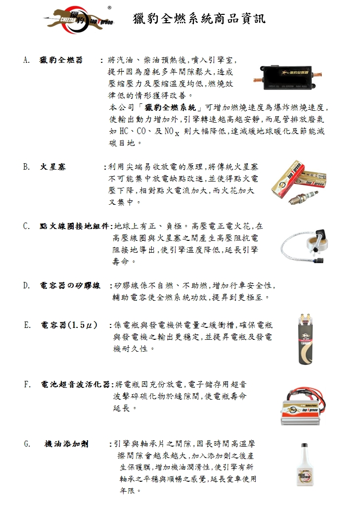“獵豹全燃系統” 新型專利產品、環保新產品 1/20 原車車價‚ 新車功力、全新體驗 本公司「CHEETAH 獵豹全燃系統」可增加燃燒速度為爆炸燃燒速度 -
