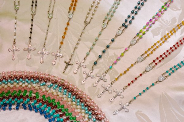 1. 天主教玫瑰念珠 2. 各種顏色的珍珠 以手工串成 既莊嚴又美麗 3. 珠子的大小有 4mm 與 6mm 4. 可以依客人款式 開模製作打樣 5. 歡迎批發訂購. tel: 02-2592