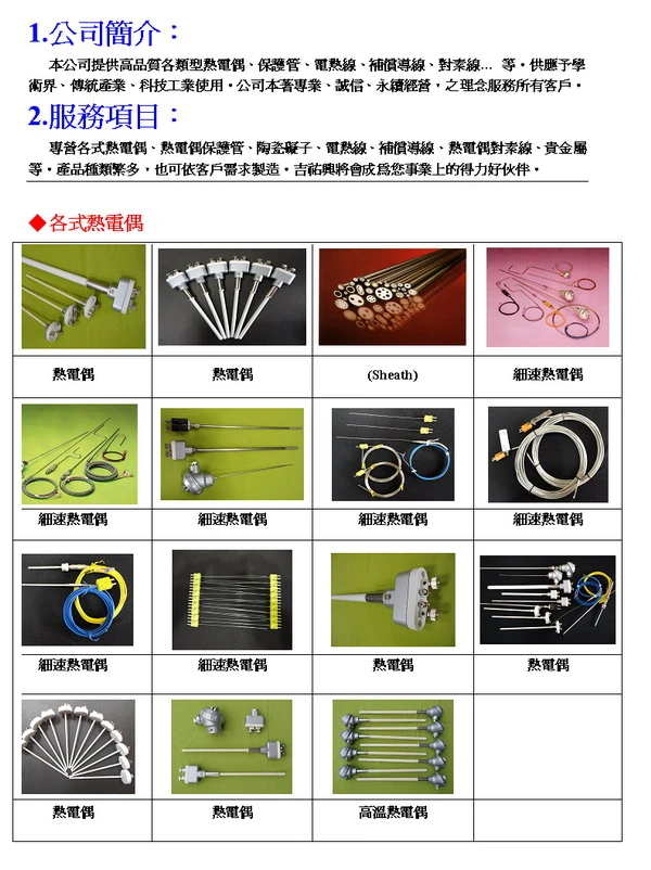 提供高品質各類型熱電偶、保護管、電熱線、補償導線、對素線… 等。供應予學術界、傳統產業、科技工業使用。公司本著專業、誠信、永續經營,之理念服務所有客戶。 製造生產各種由低溫到高溫的K、
