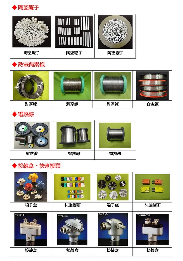 提供高品質熱電偶、補償導線、電熱線、絕緣保護管、陶瓷礙子、SIC、快速接頭、、、等製造生產各種由低溫到高溫的K、J、R、S、PT100-Type的溫度測溫探棒,品質穩定可 -