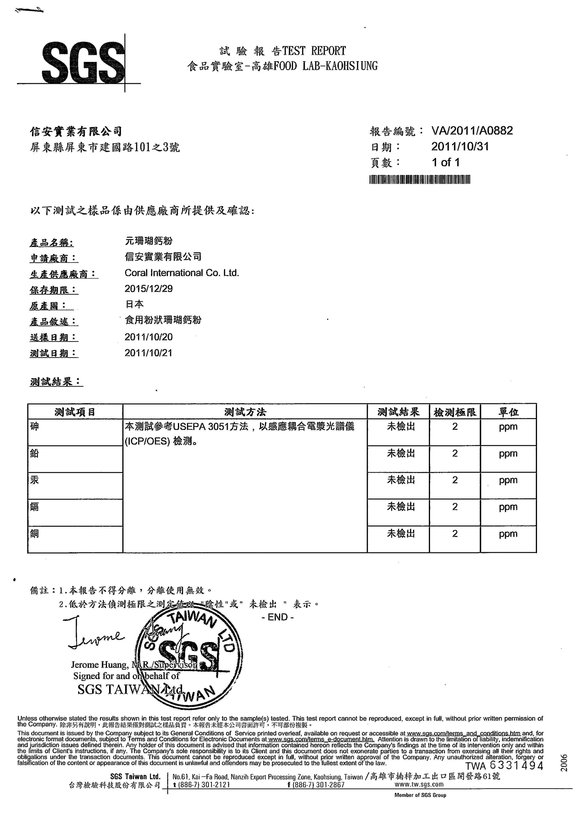 元珊瑚鈣粉不含重金屬砷、銅、鉛、汞、鎘。