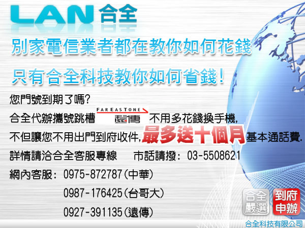 別家電信業者都在教你如何花錢, 只有合全科技教你如何省錢!您門號到期了嗎?合全代辦各家攜號跳槽,行動門市讓您免出門,詳情請洽合全客服專線