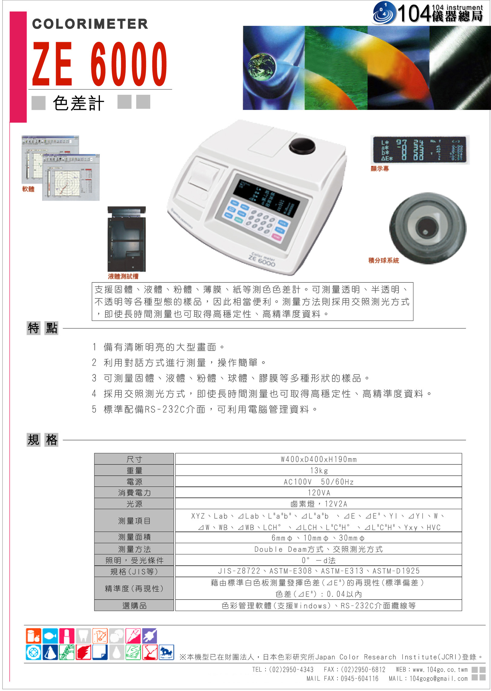 特性:可單機操作或搭配電腦(色彩作業管理系統軟體)使用與視覺完全一致的辨別能力,即使是黑/白等灰階產品,亦可清楚判讀色差值採對話式操作,輕鬆易學一機多種用途,可搭配各式各樣的樣品皆使用規格:光學條件依
