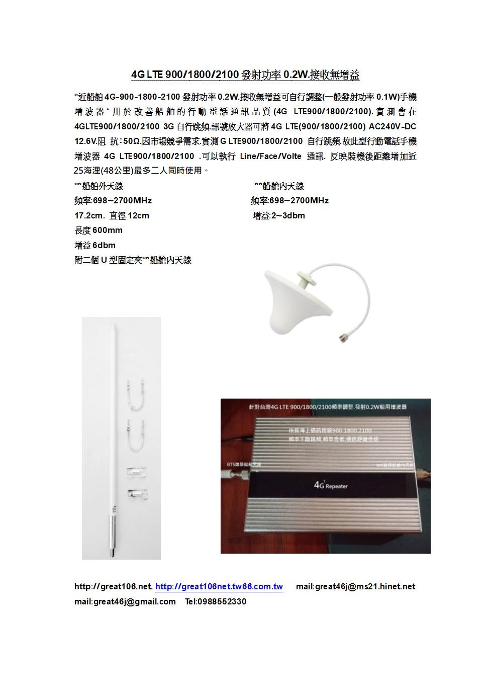 漁船專用行動電話手機增波器.用於改善船舶的行動電話通訊品質(4G LTE900/1800/2100)3G WCDMA.。4G LTE900/1800行動電話因頻率特性.電波波長較長.空曠地形距離較遠.在國內建議使用中華電信(4GLTE900)因島嶼上僅有中華電信有架設基地台.系統規格: 4G LTE 900/1800/3GF增益:電 源:AC220V-DC 12.6V..YG-30 體積尺寸:23.8x18.2x2.2CM.重量1.2Kg阻 抗:50Ω.Line.Face.Volte(Voice Over LTE )用4G LTE900 /1800/2100Line/Face通訊.
